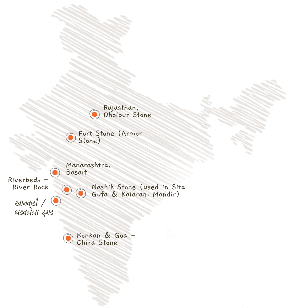Our inspiration comes from India’s forts, wada, temples, and historic structures built using region-specific stones. These materials shaped architectural identities across Maharashtra, Konkan, Goa, Rajasthan, Nashik, and beyond.